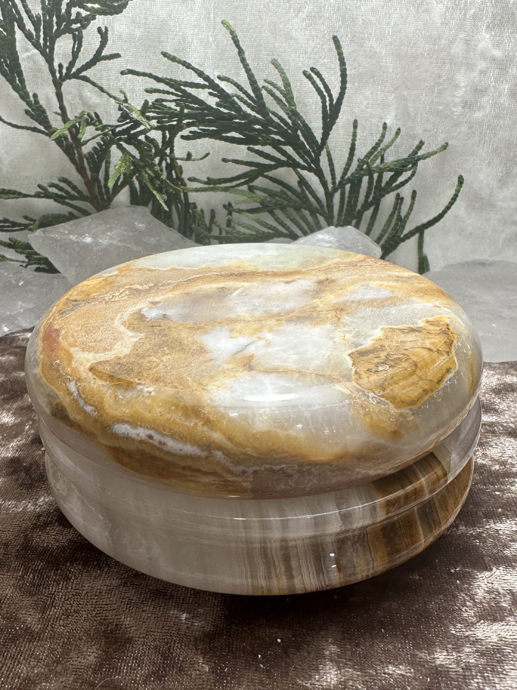 Dóza s víčkem z pakistánského "onyxu" - aragonitu. Rozměry: průměr 10 cm, výška 3 cm (s víčkem 4 cm)