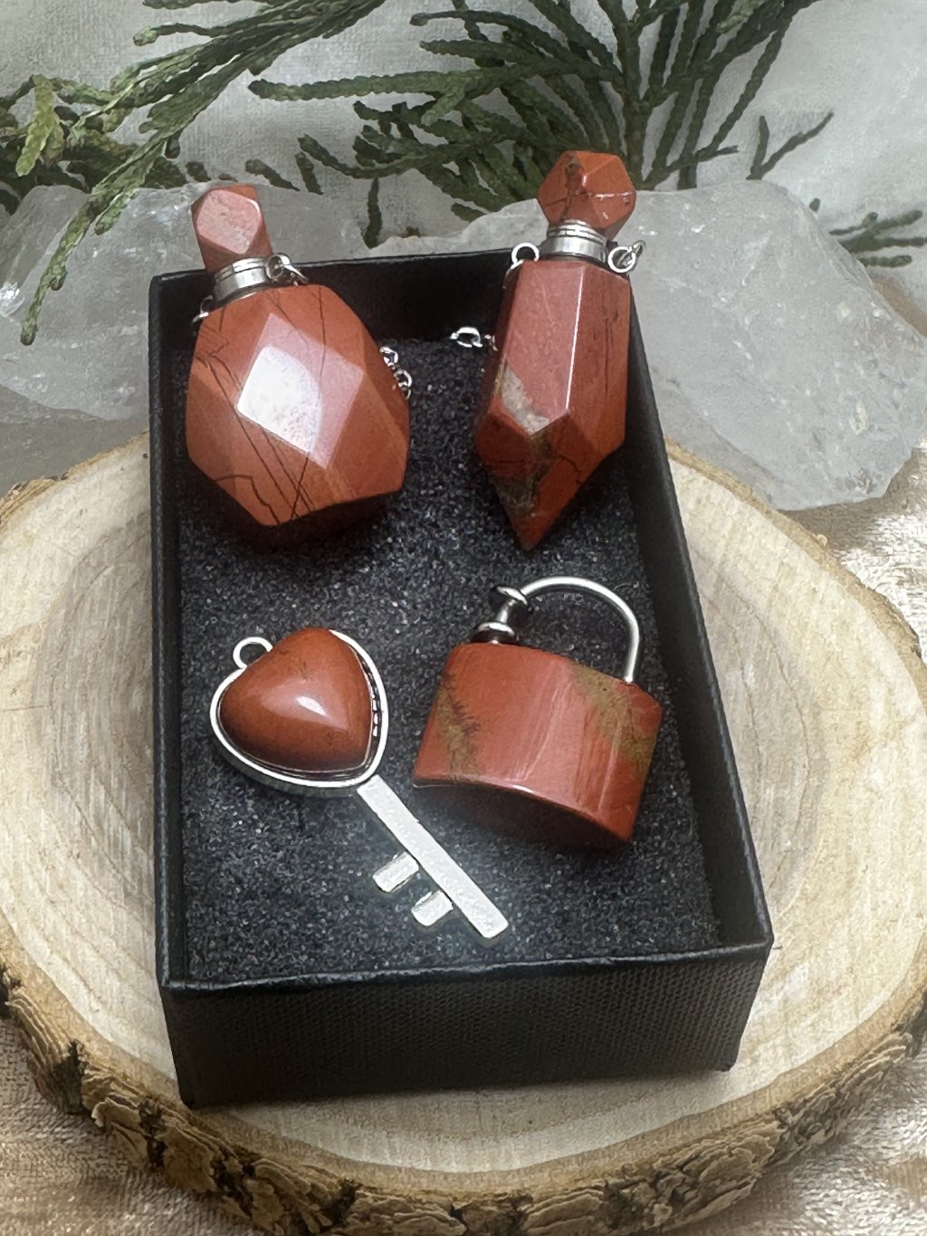 Exkluzivvní sada z červeného jaspisu - pouze v jednom provedení! Minilahvička, amulet, zámek a klíč.
