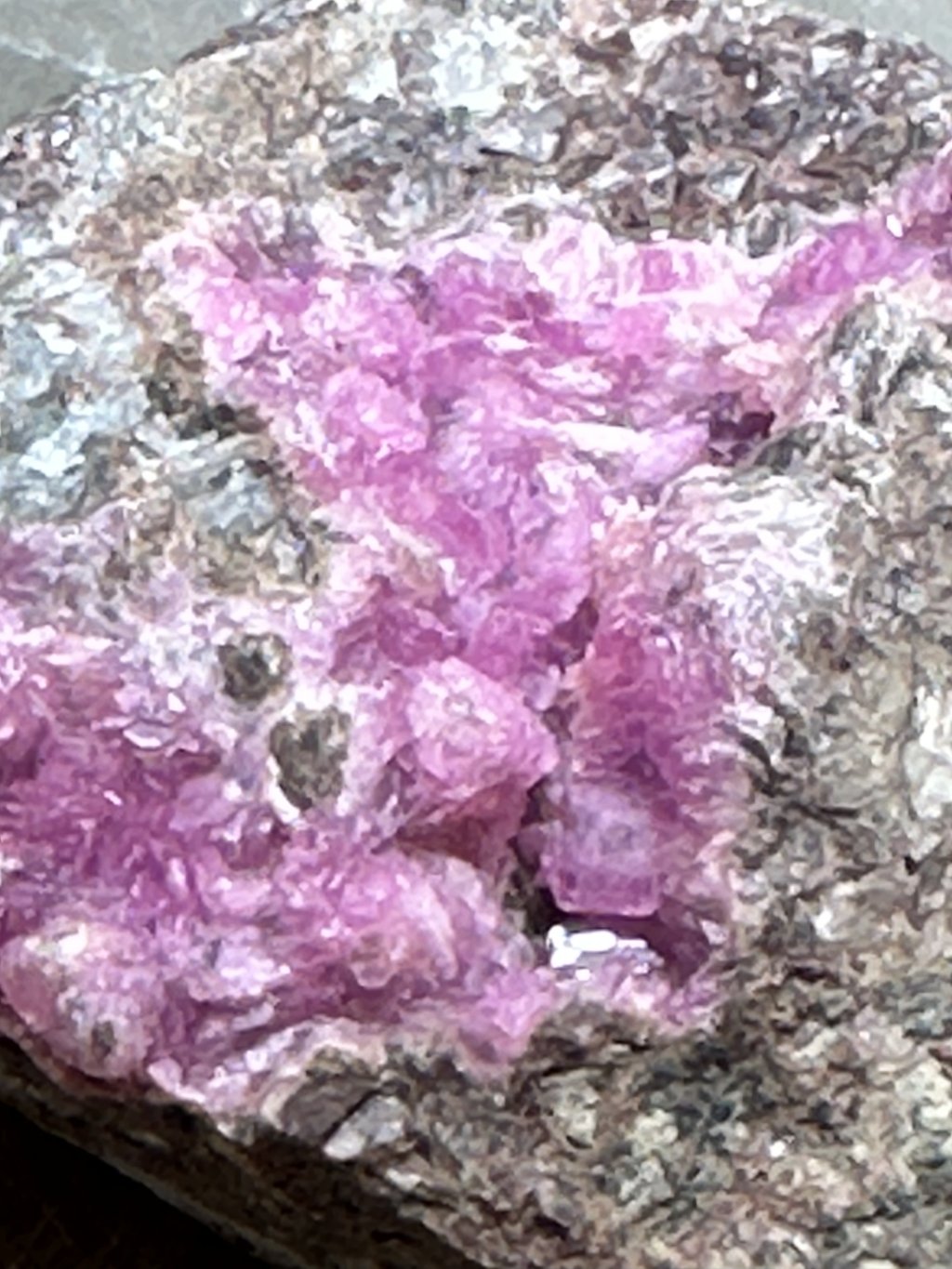 Kobaltokalcit (salrose) na hornině z naleziště Kakanda v Kongu. Rozměry kamene: 5 x 6 x 3 cm, 210 gramů