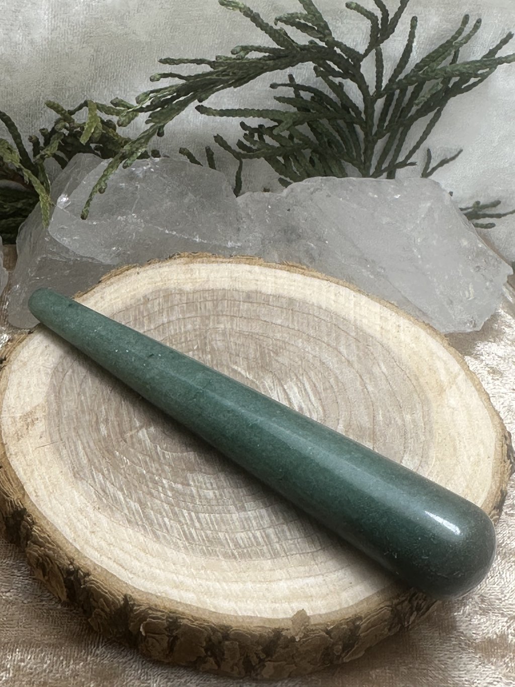 Masážní tyčka ze zeleného avanturínu se špičkou. Rozmery: délka 10,7 cm, průměr na jednom konci 1,7 cm, na druhém (špička) 6 mm.