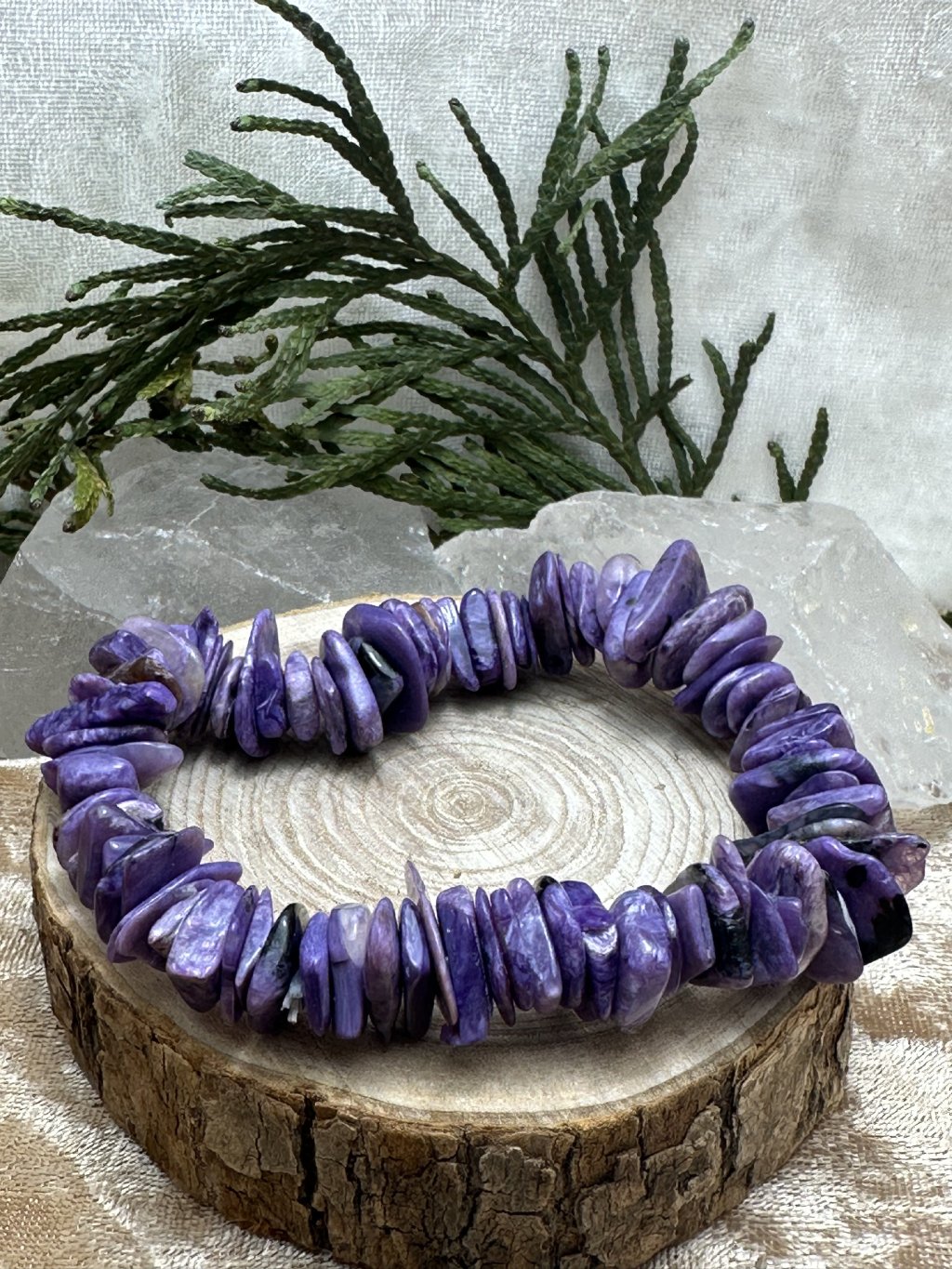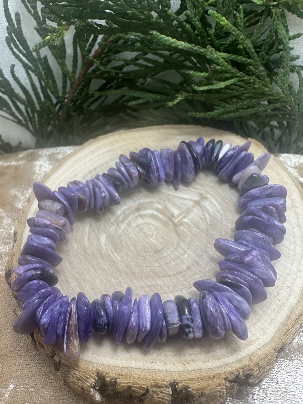 Luxusní náramek z tromlovaných destiček čaroitu v extra kvalitě. Vnitřní průměr náramku 8 cm, průměr leštěných čaroitových destiček 1 cm.