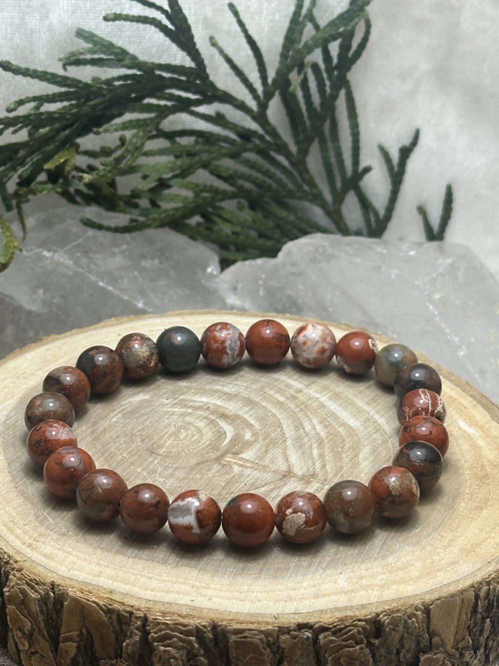 Náramek jaspis brekcie. Kulička má průměr 8 mm.