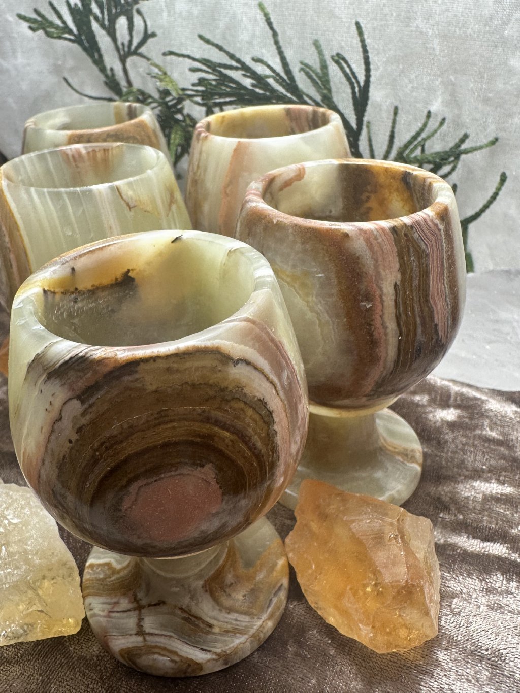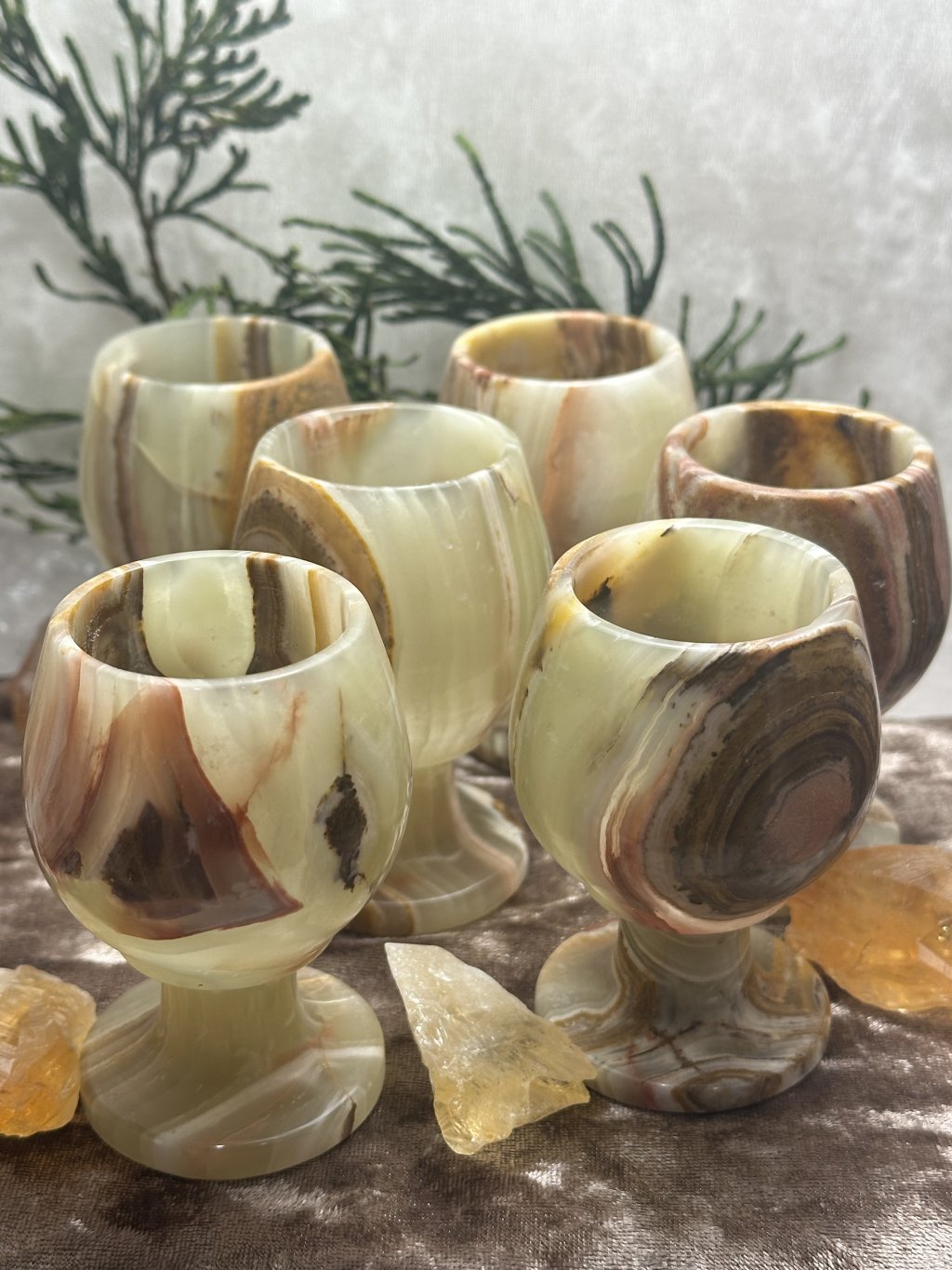Luxusní sada šesti pohárků z pakistánského "onyxu" - aragonitu. Rozměry pohárku jsou 5 x 7,5 cm. Dostanete set z fotografie.